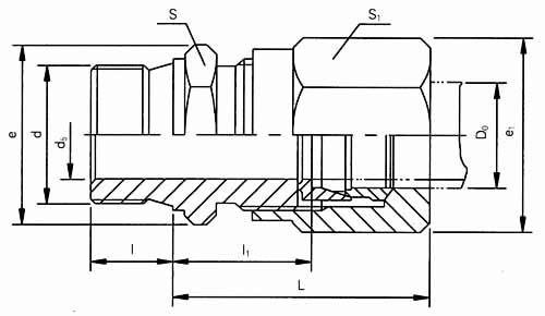 公稱壓力J級,管子外徑D0為14mm的卡套式端對接直通管接頭: