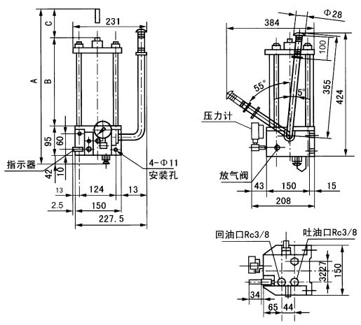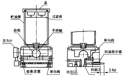 5、泵上回油指示器的作用是操作者通過觀察指示器活塞指示桿的運(yùn)動行程,就可知道潤滑系統(tǒng)的供油狀況。使用時,先計算好各潤滑部位所需的給油量,配置分配器,并把主分配器上多設(shè)的一個出油口與手動潤滑泵的回油口接通,使?jié)櫥祷氐街甘酒髦校绶祷氐挠土坷塾嬤_(dá)到3.28mL,則指示器的活塞指示桿全部伸出,表示各潤滑點(diǎn)已根據(jù)需要完成一個周期的給油,應(yīng)停止供油并把回油指示器的指示桿推進(jìn)。 |